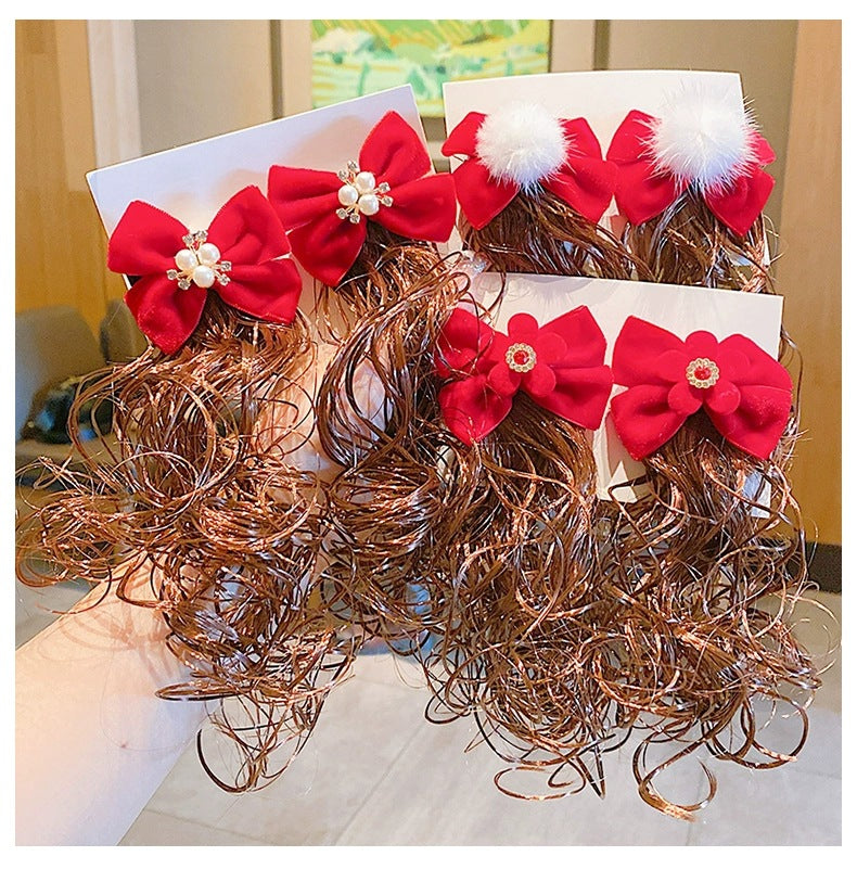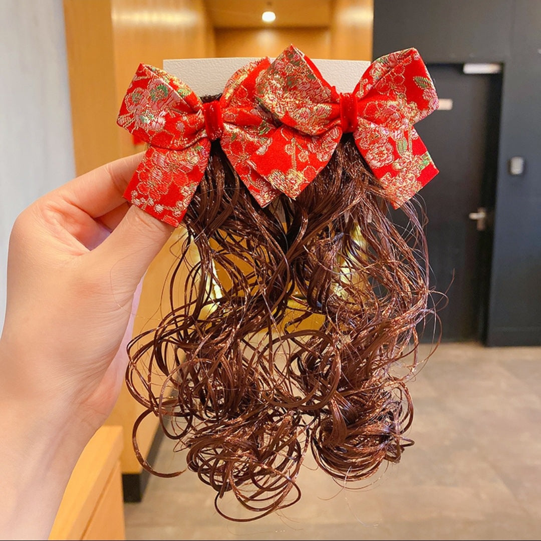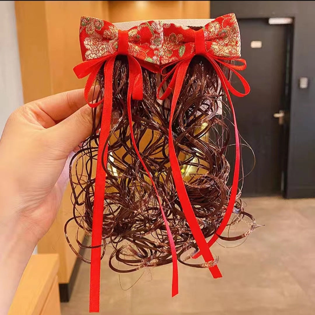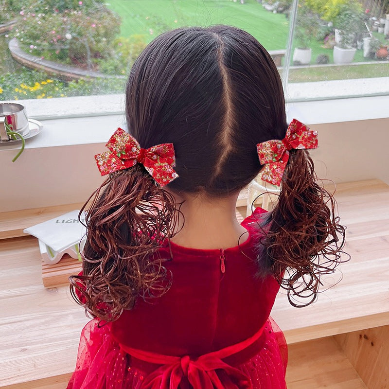 Children's festive red hairpin wig bowknot Chinese style Hanfu New Year's headdress baby ancient style fur ball hairpin