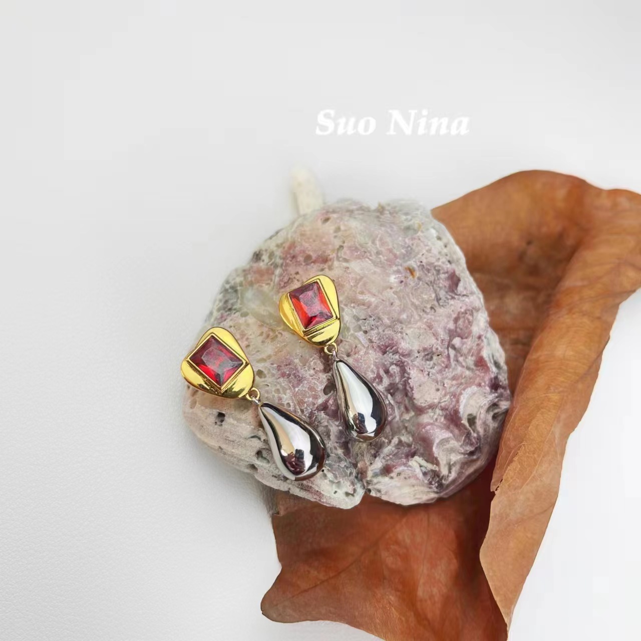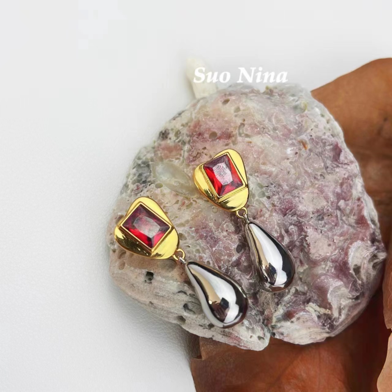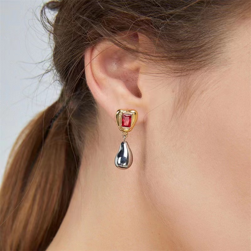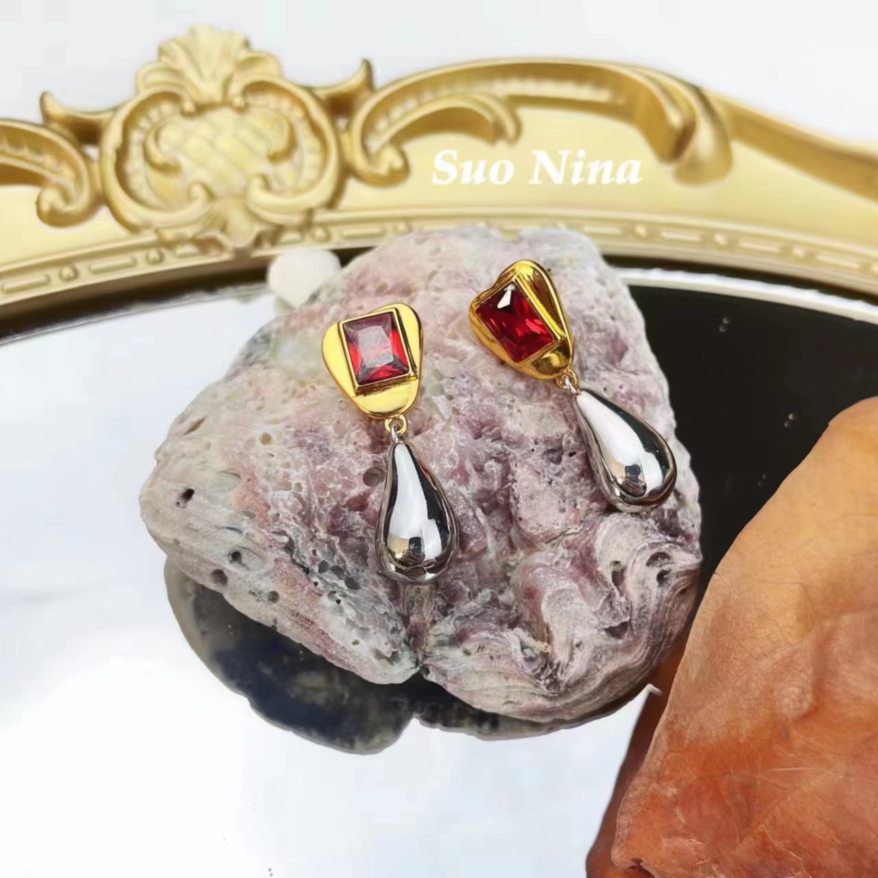 European and American Retro Red Baby Inlaid Water Drop Tears Drop Earrings Niche Design Simple Versatile Personality French Women