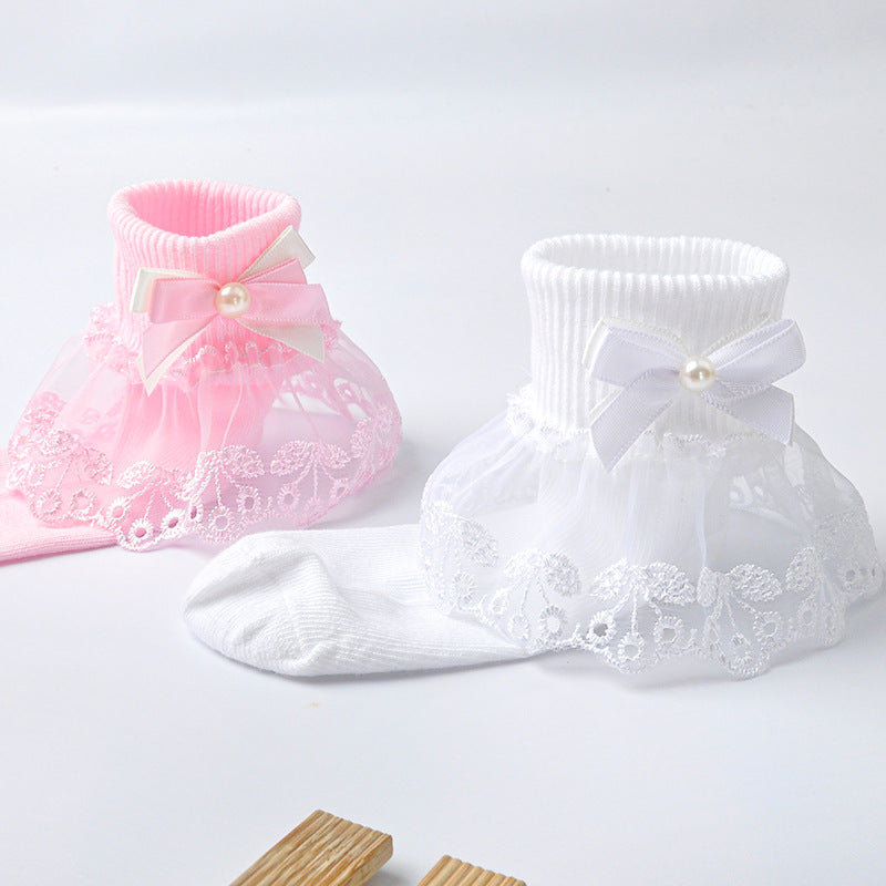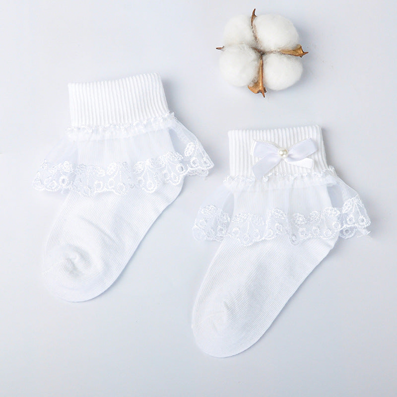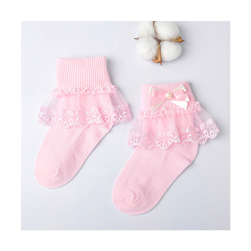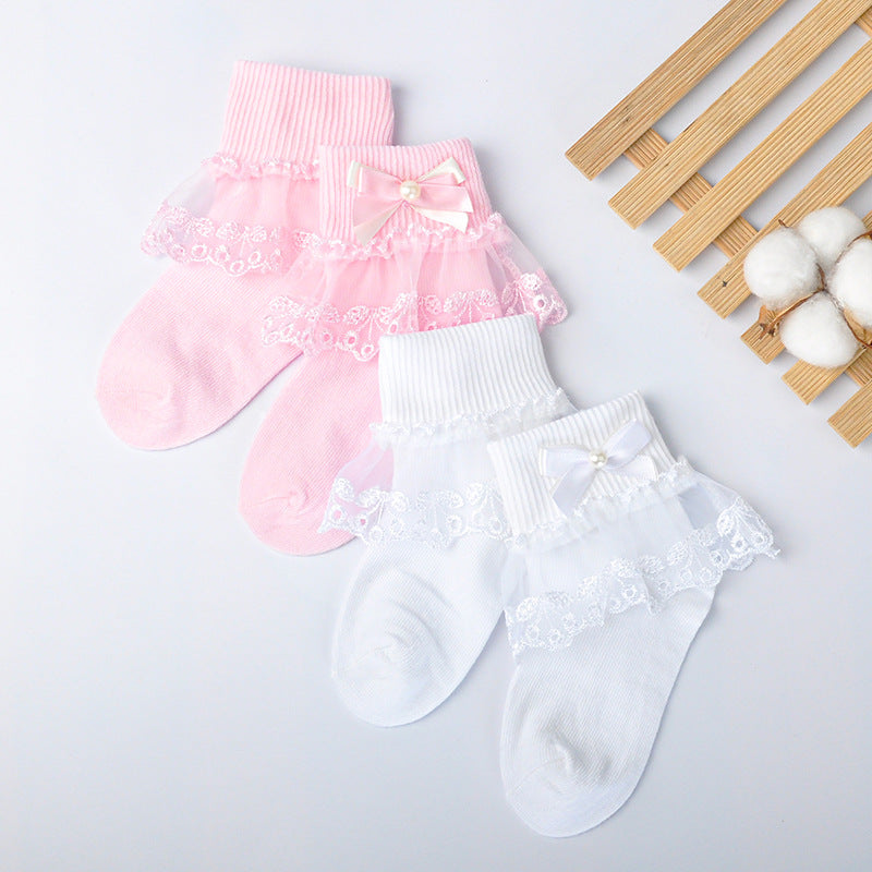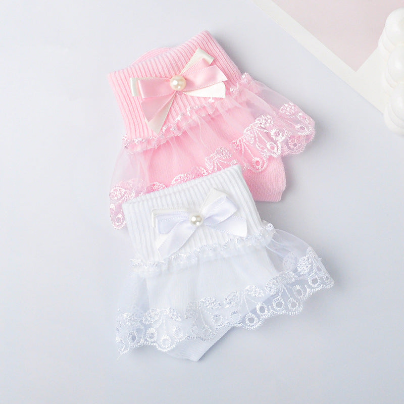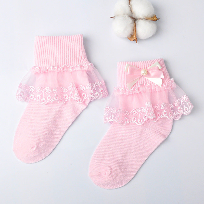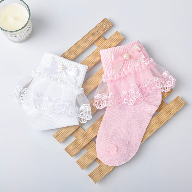 Girls cotton socks pure color lace embroidery lace children socks bowknot pearl short tube cotton socks baby dance socks