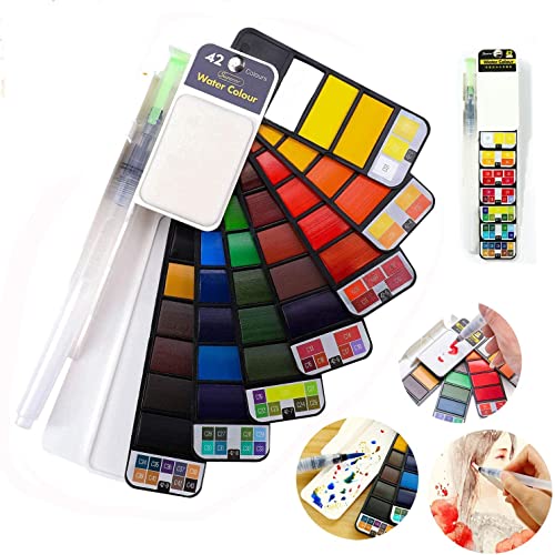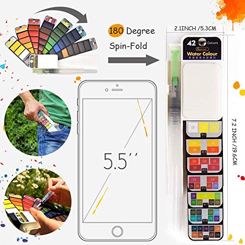 SYGA Watercolor Paint Set Foldable 42 Colors with 1 Brush Pen and Sponge Platte Portable Travel Solid Watercolor Painting Kit Gift for Adults Kids Drawing Artists Field Sketch Set Outdoor Painting Supplies