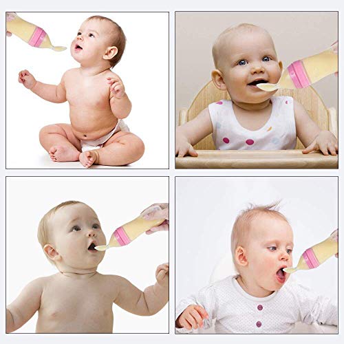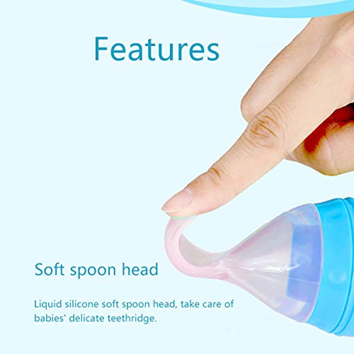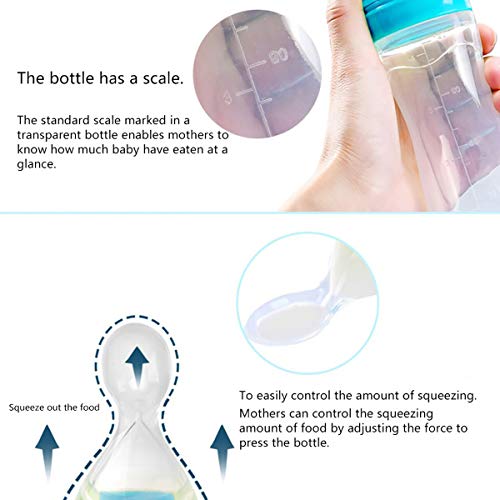 Feed baby without confusion : it's very strenuous to help babies drink syrup, have grinding and fluid food, because not only do you need to carry bowls and spoons, but also hold babies. The spoons and bowls may be knocked over by restless babies accidently, making all the things messy, and mothers feel headache. If you have the same trouble, please try this squeeze feeding spoon! Suitable for many food : the adoptive silicone material is safe, and high temperature resistant. The spoon has an unique cover, and is suitable for feeding babies with mushy rice, grinding food, milk and so on. The feeding bottle enables you to squeeze out the amount of food you need without wasting any, becoming an essential artifact for babies to transit their weaning periods. Clean and healthy : cover is equipped for keeping the spoon clean. It's very convenient for you to unscrew the spoon handle, and clean it in a dishwasher. Includes protective cover to reduce leaks and spills, making the squeeze feeder ideal for travel. Mother needs 3 hands for feeding, one for baby, one for bottle and one for spoon which is not possible. With this unique design of bottle with spoon, mother can hold baby with one hand and can feed with another hand conveniently.
