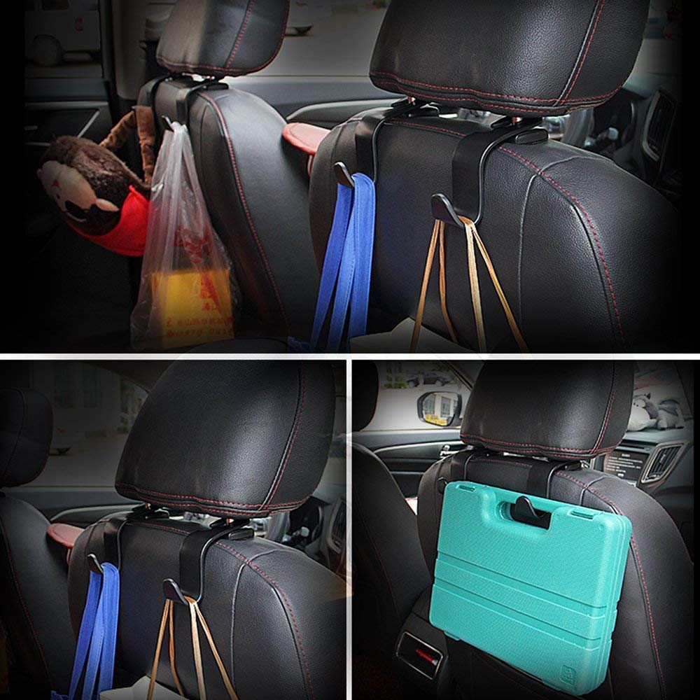 Material : These car hooks are made of premium quality plastic material and also it is wide & deep enough for your purse, backpack and so on.Organize car space : it converts your car’s headrest into a storage space and help you to keep your car's interior perfectly clean and organized. The headrest hook can hang groceries, handbags, purses, schoolbags, umbrellas, water bottles, shopping bags, baby supplies and much more.Easy Installation: The car headrest hook do not need to take off the headrest, also no tools required to install as due to its simple designUniversal fit : Can be used in everywhere, fit most of cars.Baring Capacity: Each car headrest hook can hold up to 6kg.SYGA car hooks comprises high-quality ABS plastic material which fits on the seat headrest of most cars. Upgraded side opening design for easy installation, no need to remove the headrest. This item can be used for the front or back of the seat the hook will easily hold up to 6KG/ per hook. Double-layer design saves more space, help you keep your car interior perfectly clean and organized, don't worry your shopping bags be placed on the floor or seat rolling around and spilling.