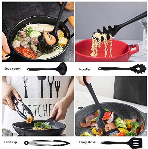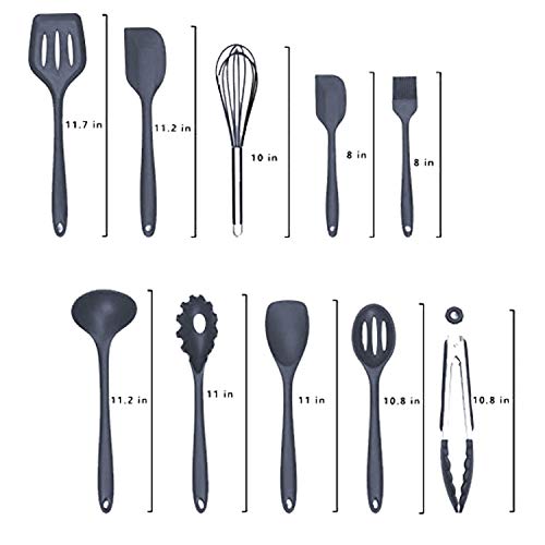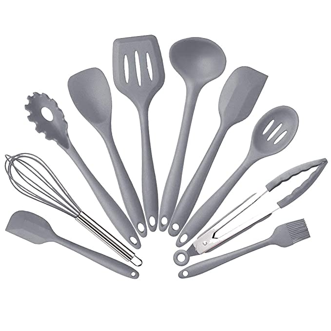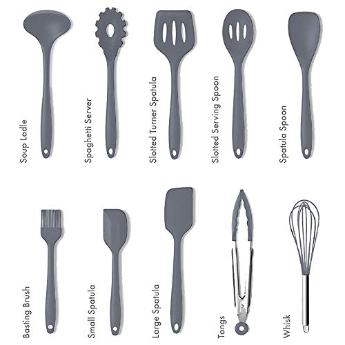 About this item MEET ALL YOUR NEEDS: 10 different silicone cooking utensils: Ladle, Pasta Fork, Spoonula, Slotted Spoon, Tongs, Turner, Large Spatula, Whisk, Small Spatula, Basting Brush. Meet multiple cooking demands. Best for cooking or bbq.HIGH HEAT 450°F PRO-GRADE SILICONE: Our BPA Free and FDA Approved Silicone is Safe for...