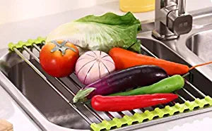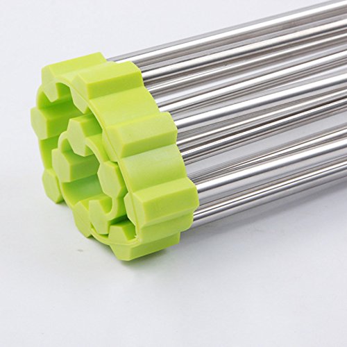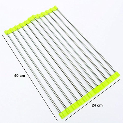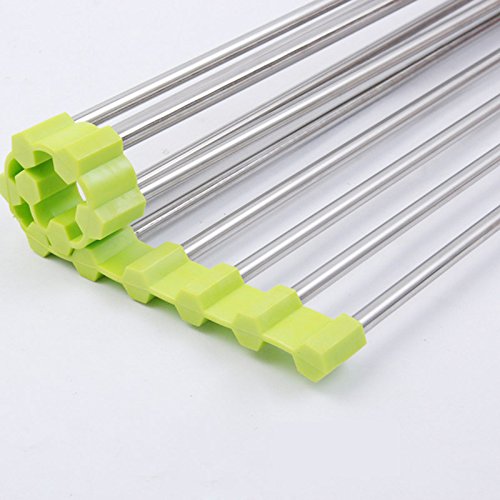 Over sink kitchen dish and cup drying rack using the dish drying rack you can dry your dishes, glassware or pots and pans and so on. When you finish it, you just roll up, it will save your kitchen place and this will not affect the appearance of your own kitchen. Good practicability simple operation, good practicability: Roll-Up, over-The-Sink drying mat. Dish mat unrolls above an open sink for air-Drying washed dishes, fruits or vegetables. will not rust: Constructed from stainless steel save place: Easily roll up to save place, drain juices and water directly into your sink. appropriate .