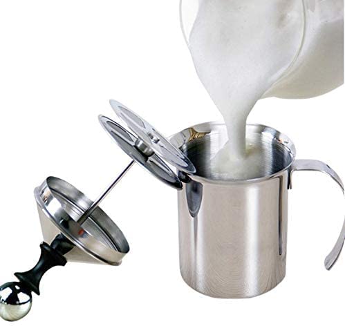 SYGA Milk Frother Jug, Stainless Steel Hand Pump Milk Frother Double Mesh Manual Milk Foam Maker Milk Steamer for Cappuccino Coffee Latte- 400ml