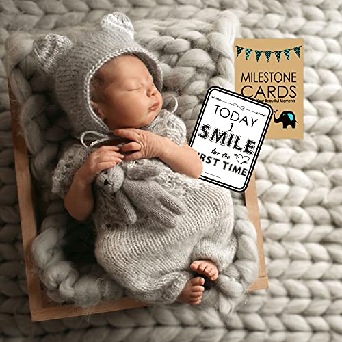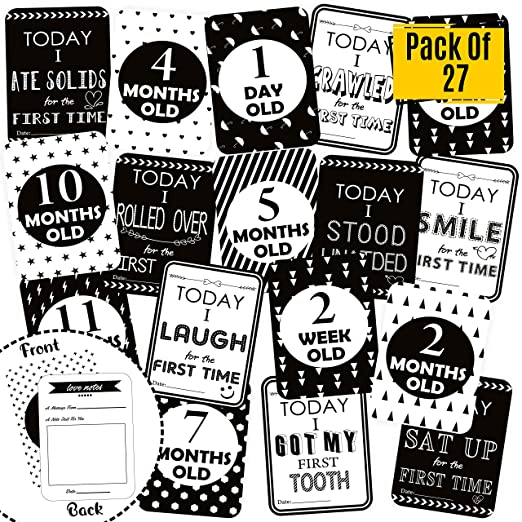 Milestone cards are a great to way to document your baby's first year - capturing all the special moments and milestones, they also make a great baby shower gift idea not just the usual baby milestone cards of capturing your babies monthly birthday, this milestone card set captures some of the funnier experience of parenting and those proud parent moments. 10 Moments: today i smiled for the first time today i sat up for the first time today i laughed for the first time today i ate solids for the first time today i crawled for the first time today i rolled over for the first time today i got my first tooth today i said my first word today i took my first steps today i stood unaided this full set of 27 baby milestone cards includes16 milestones (age): 1 day old1, 2, 3 week old1, 2, 3, 4, 5, 6, 7, 8, 9, 10, 11 months old1 year old we are proud to say that our products are made in India.