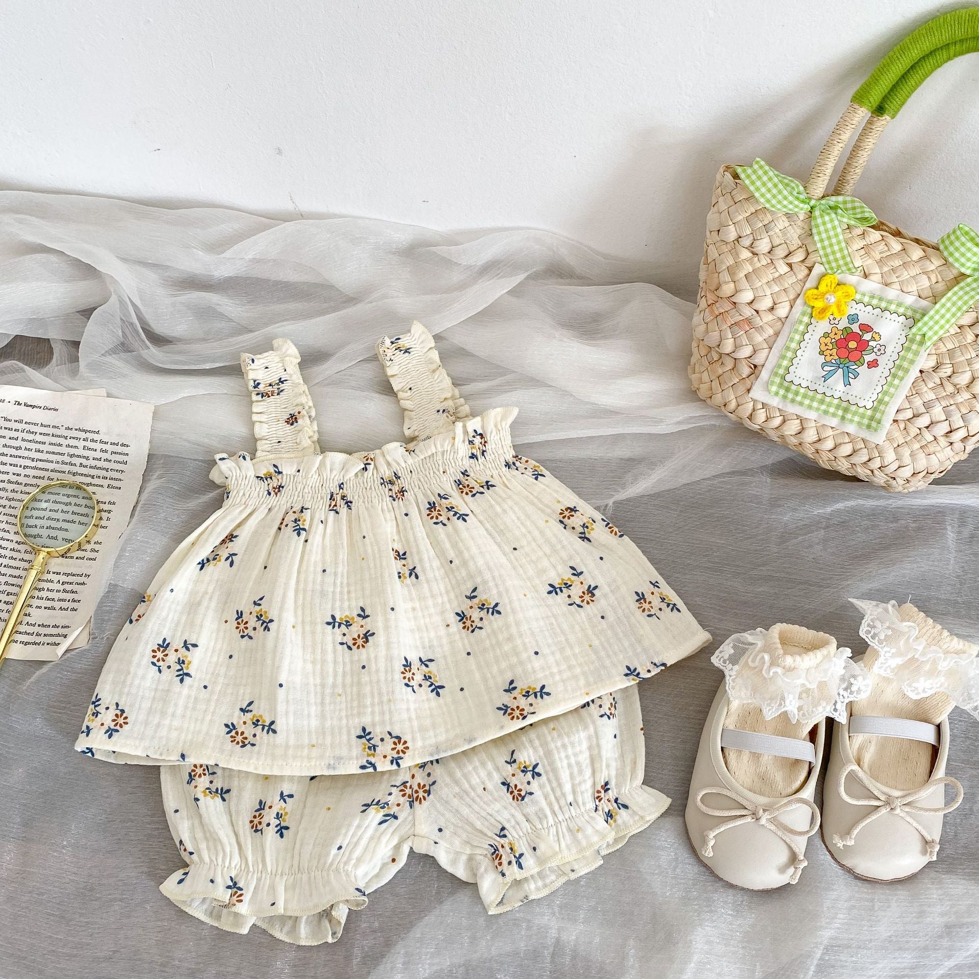 0-3 years old baby girl summer sling suit foreign style floral double-layer gauze top lantern shorts girls two-piece set
