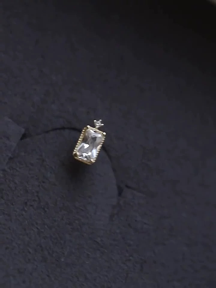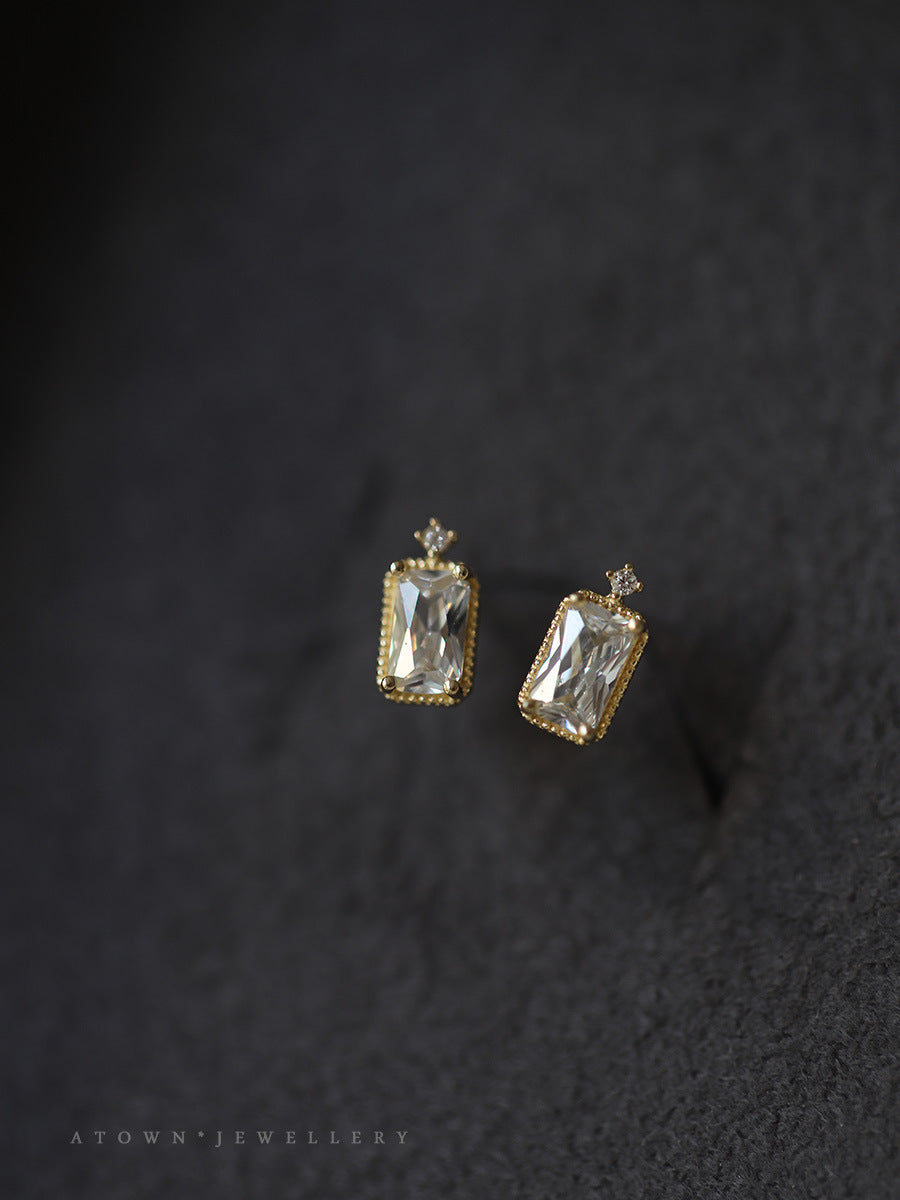 14K gold plated earrings small diamond rectangular ice cube zircon S925 silver needle retro French mini earrings earrings
