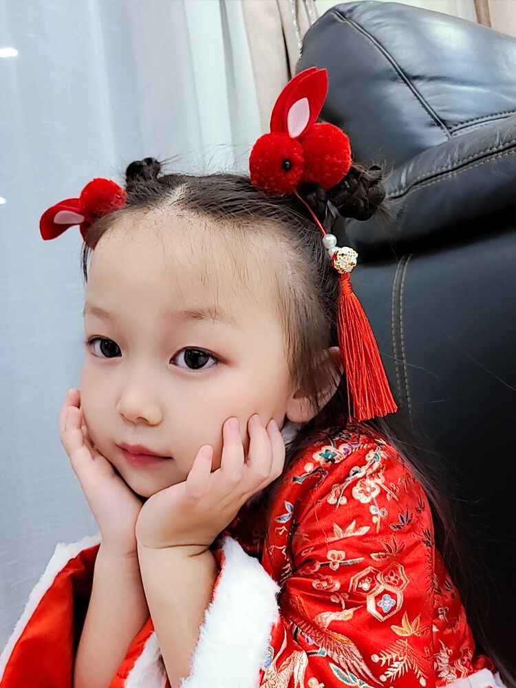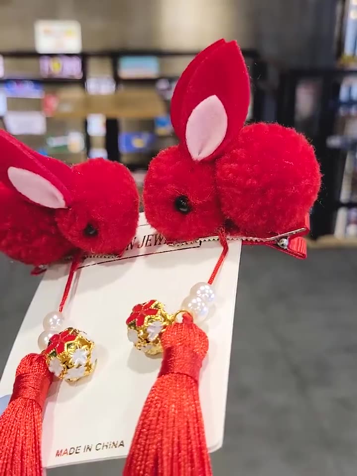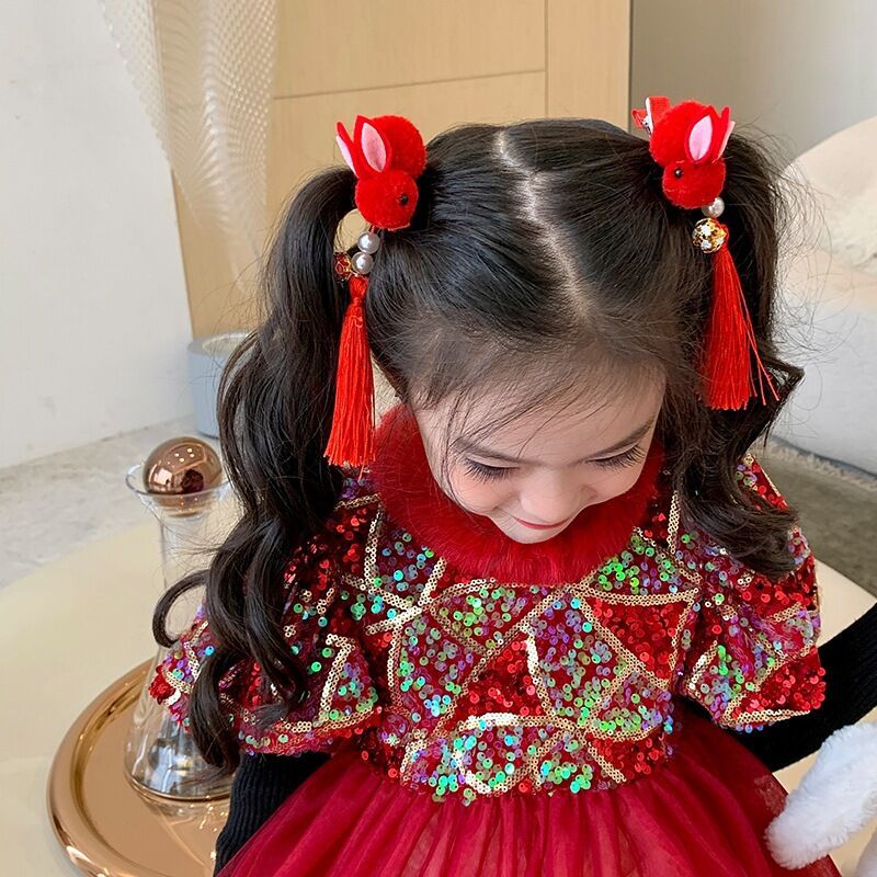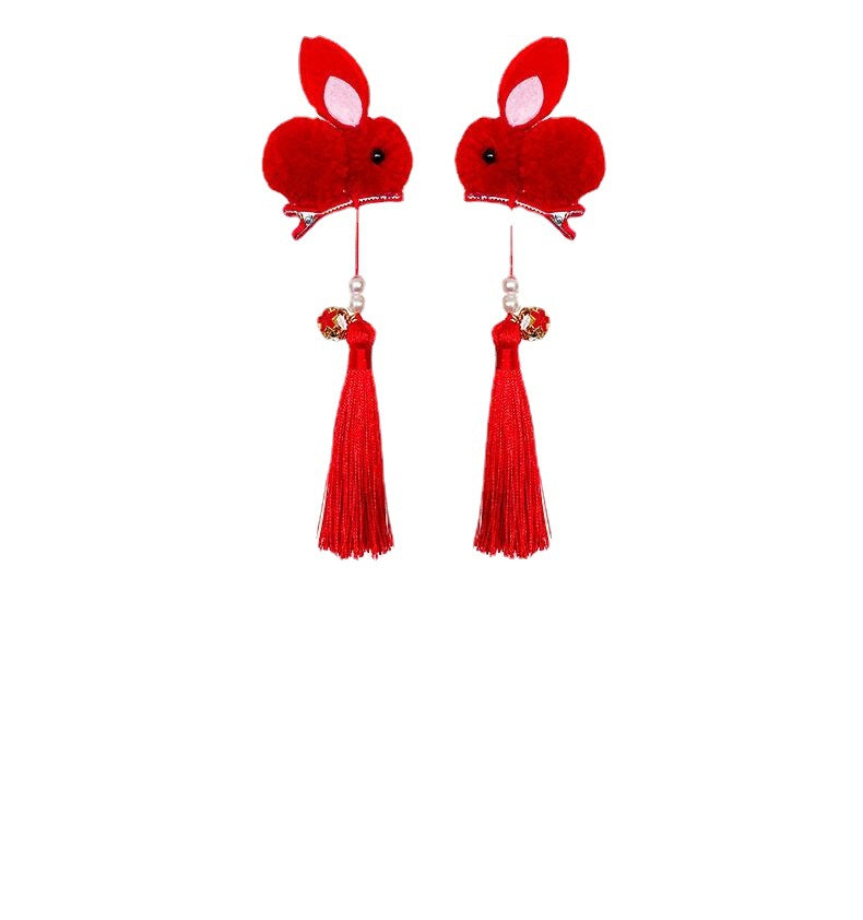 2 Packs~ Plush Tassel Bell Rabbit Hairpin Antique New Year Style Red Girl Cute Pearl Pink Pair Clip