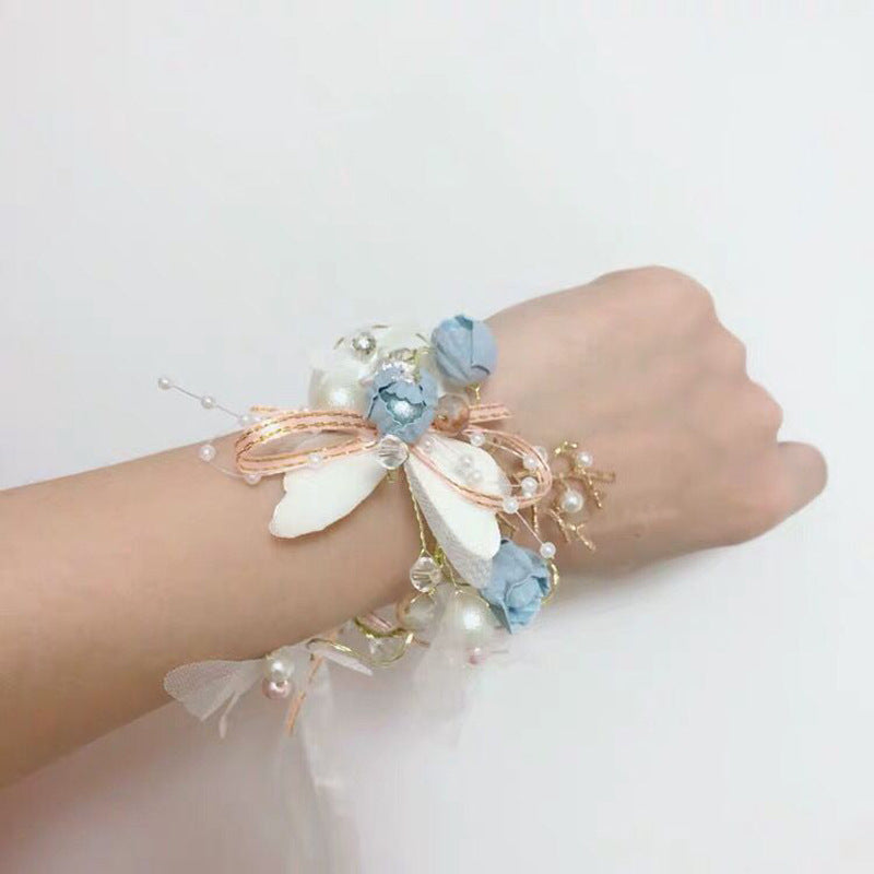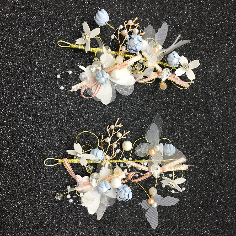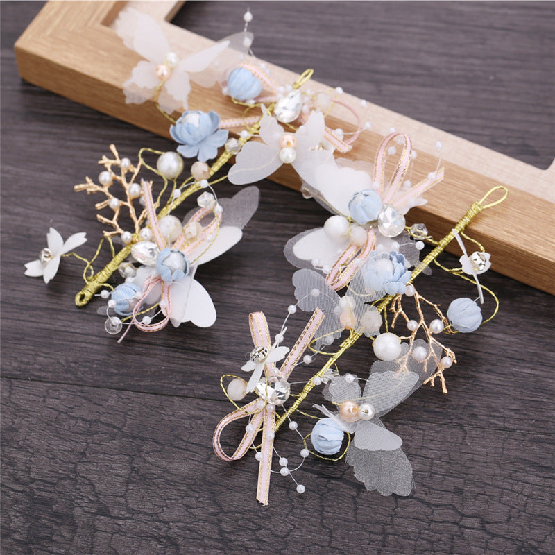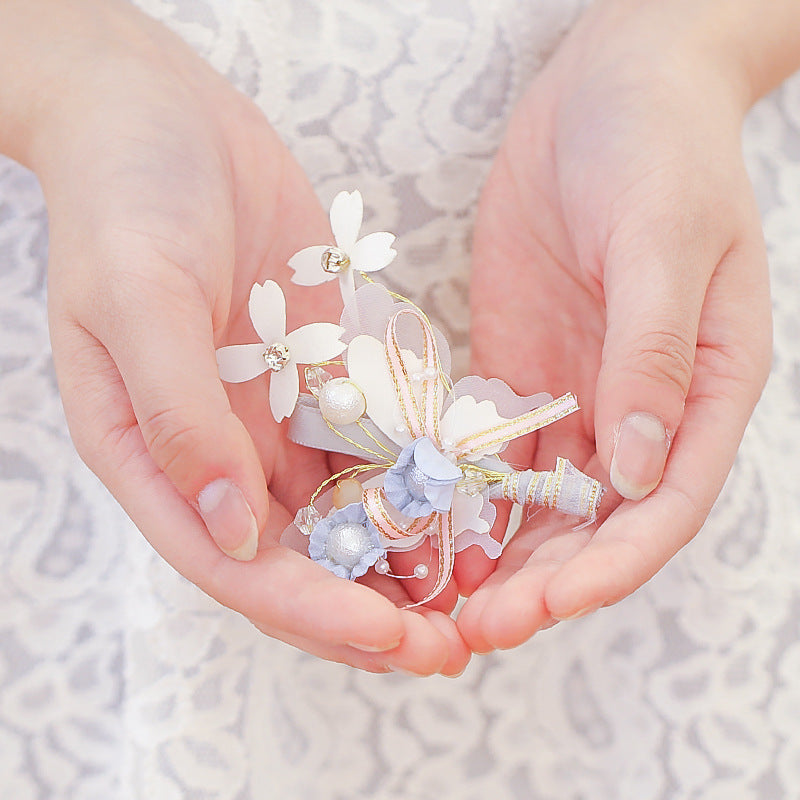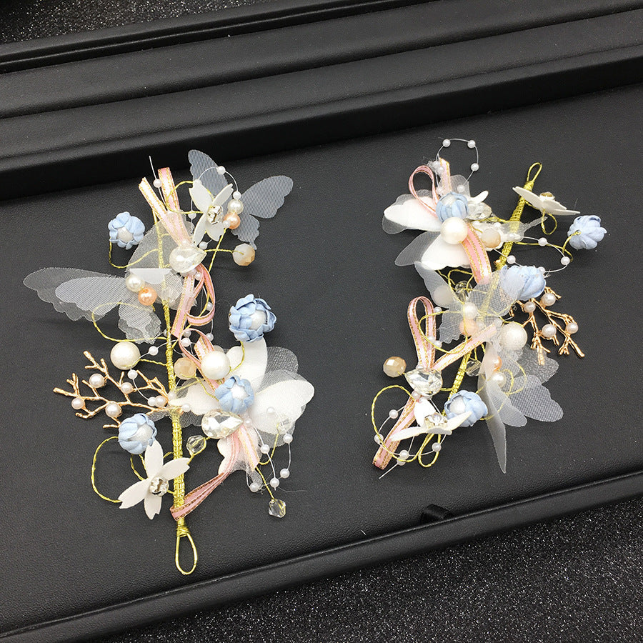 color : A complete set of 3 pieces, a single blue hair band, a refined version of short hair accessories, a blue bracelet, blue boutonniere, white wrist flower, purple bracelet, small blue bracelet, small pink bracelet, blue boutonnier e ,pink boutonniere ,pink long hair band