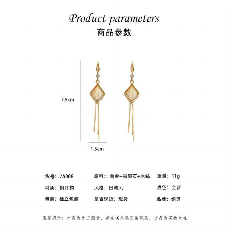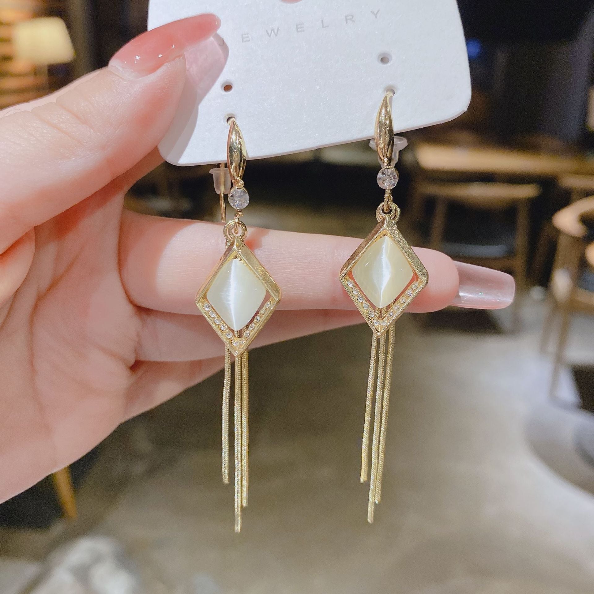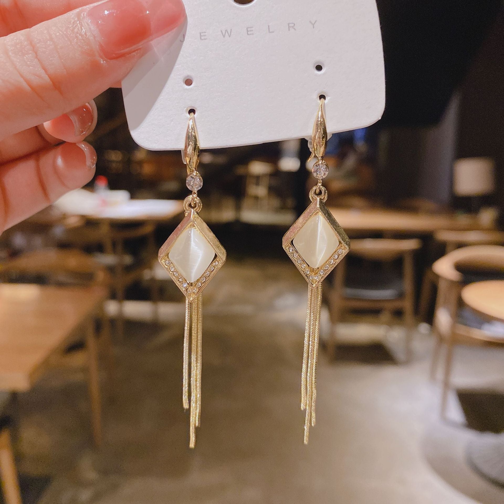 2021 New Tassel Rhombus Earrings Opal Exquisite Temperament High-end Atmosphere Long Super Immortal Internet Celebrity Earrings