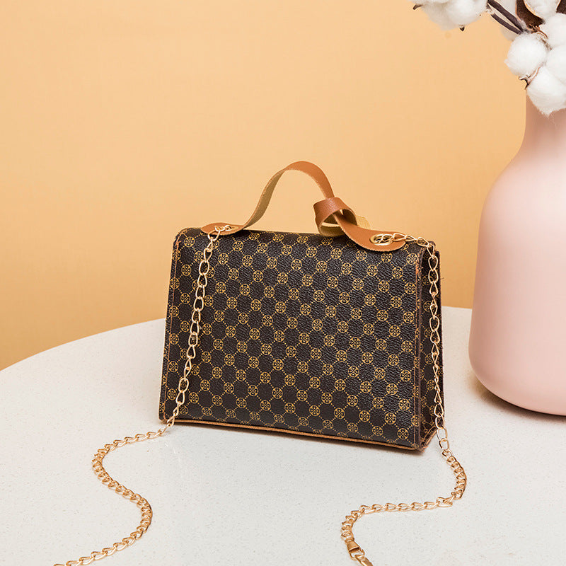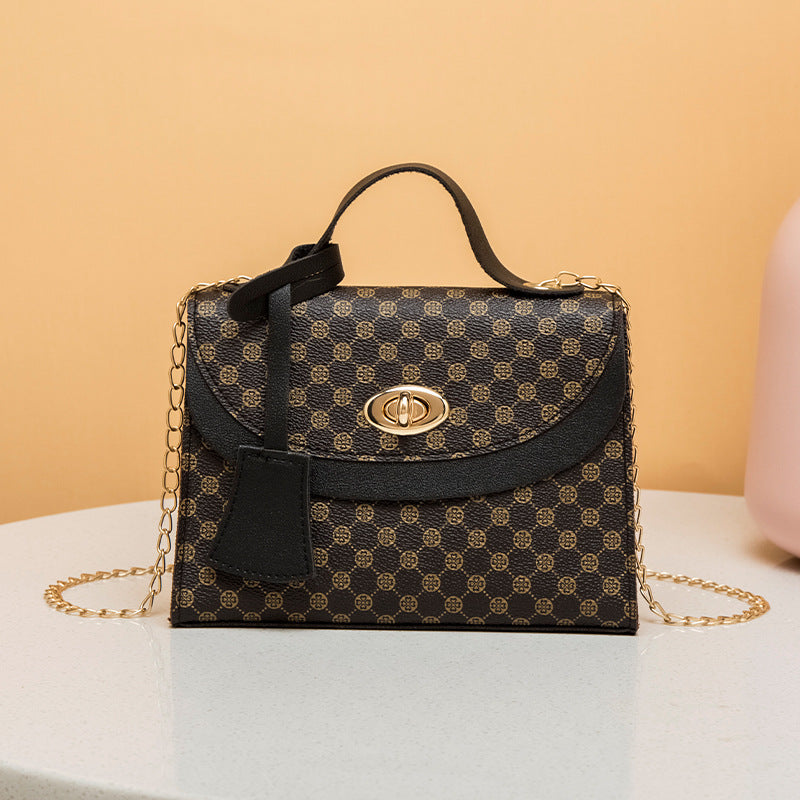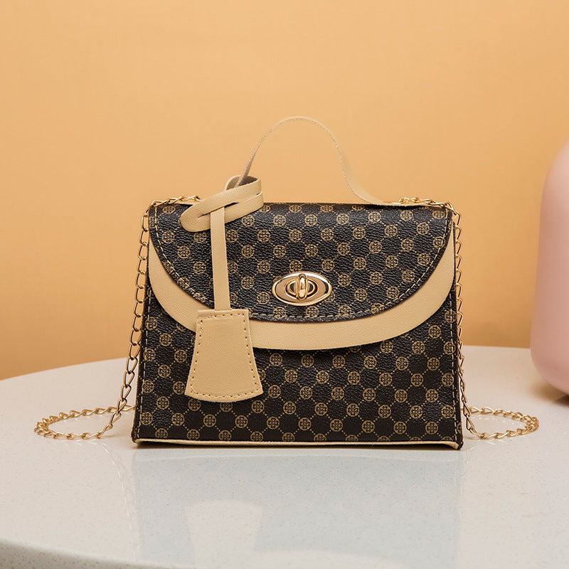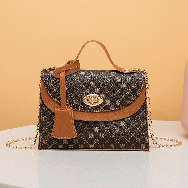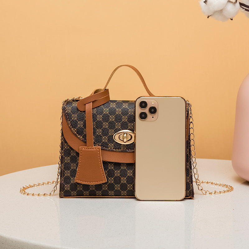 2021 new women's bag circle printing color contrast hanging leather round lock small square bag Kelly bag casual mobile phone bag foreign trade bag