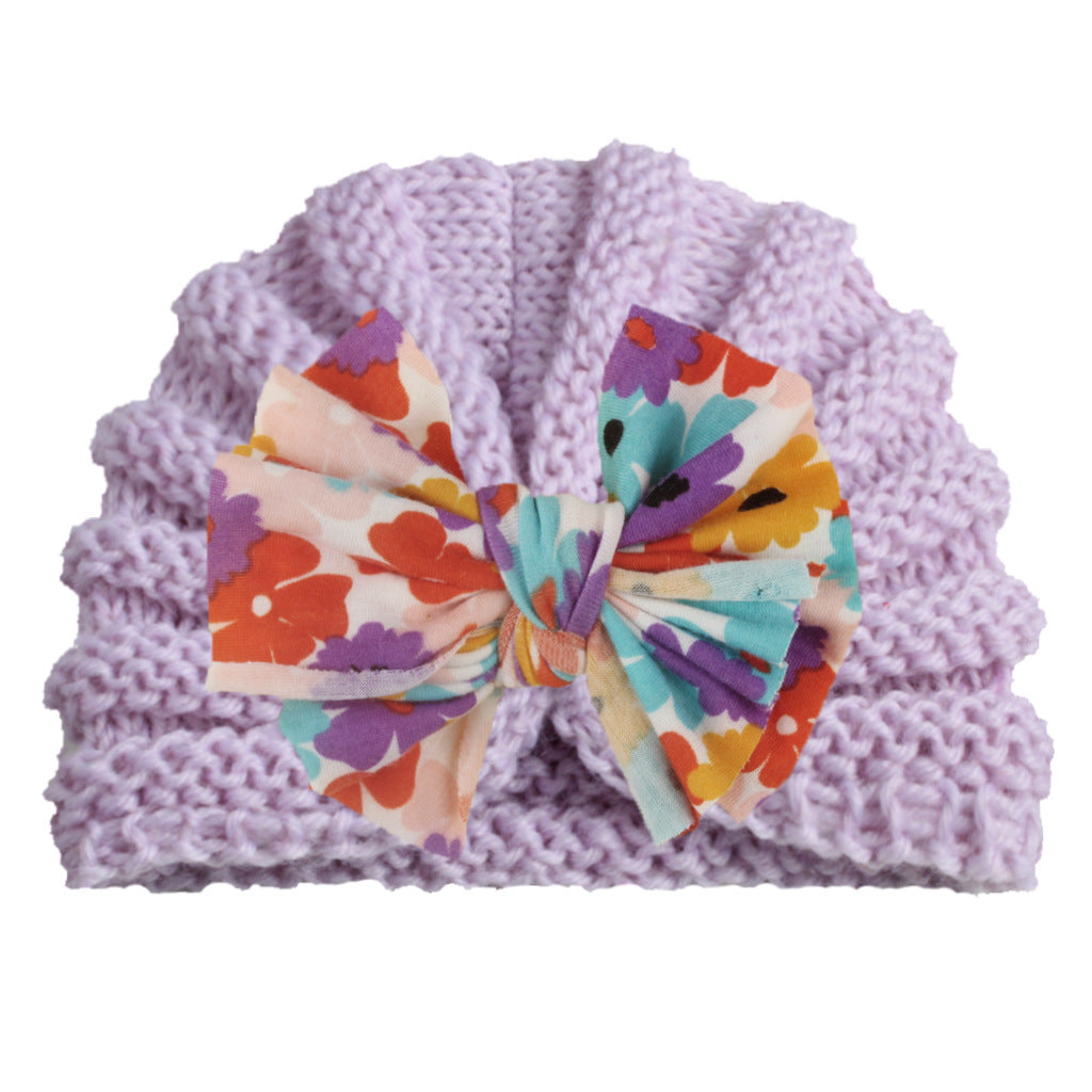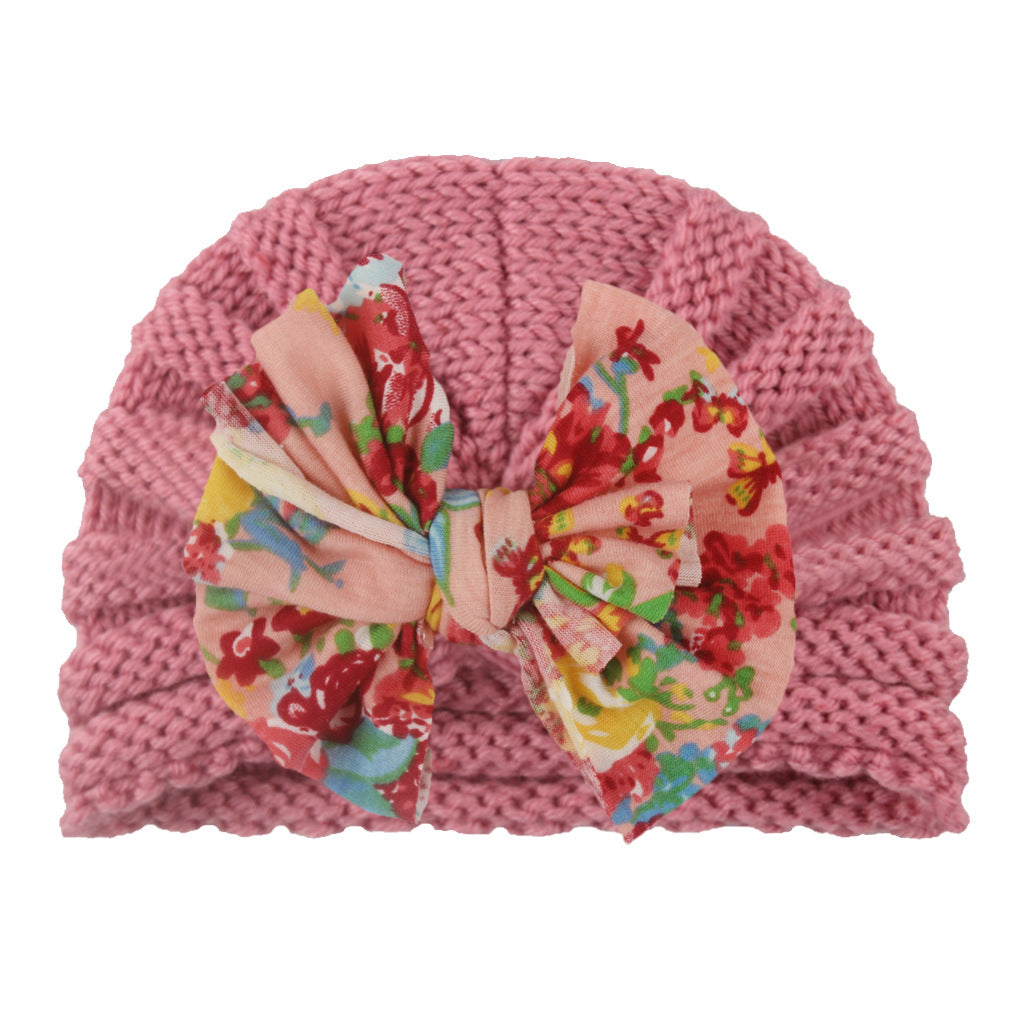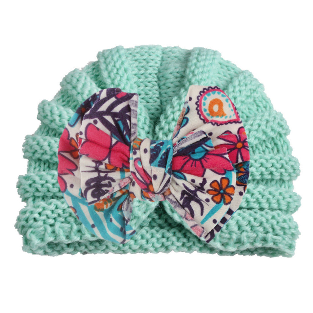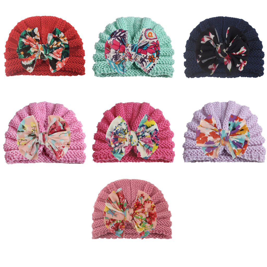 2022 European and American new baby print bow hat children autumn and winter warm knitted hat baby hat