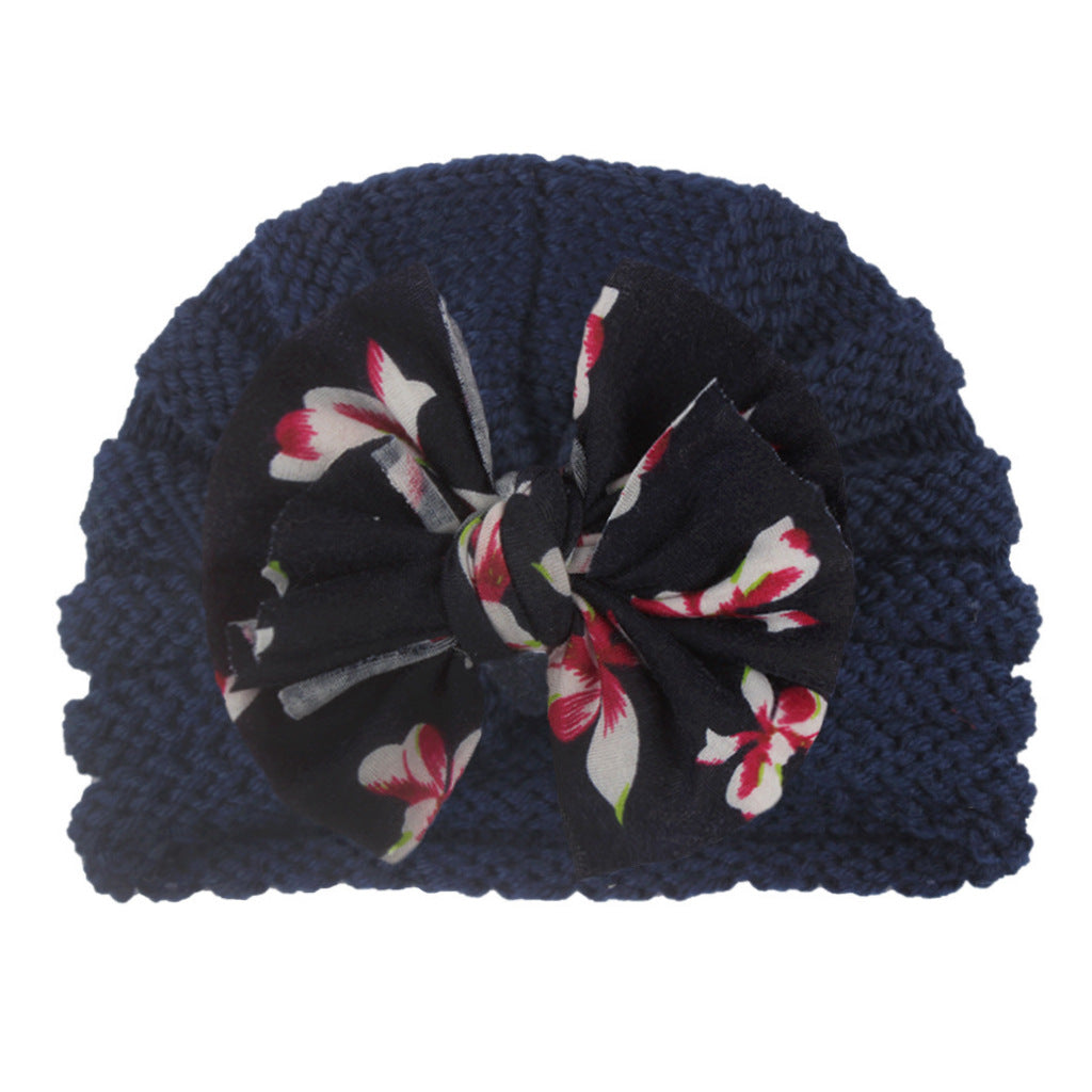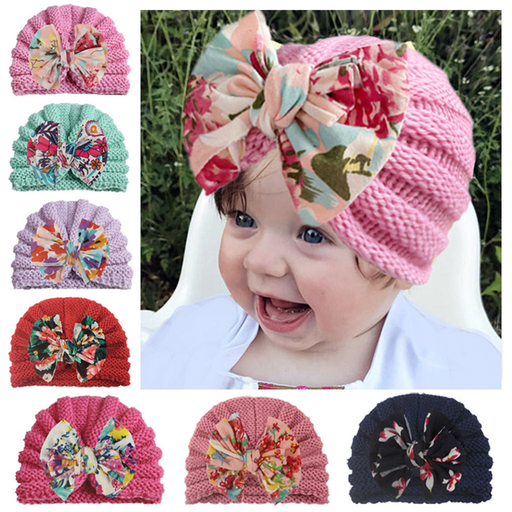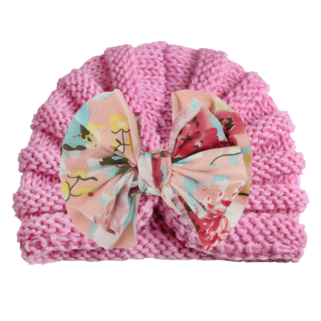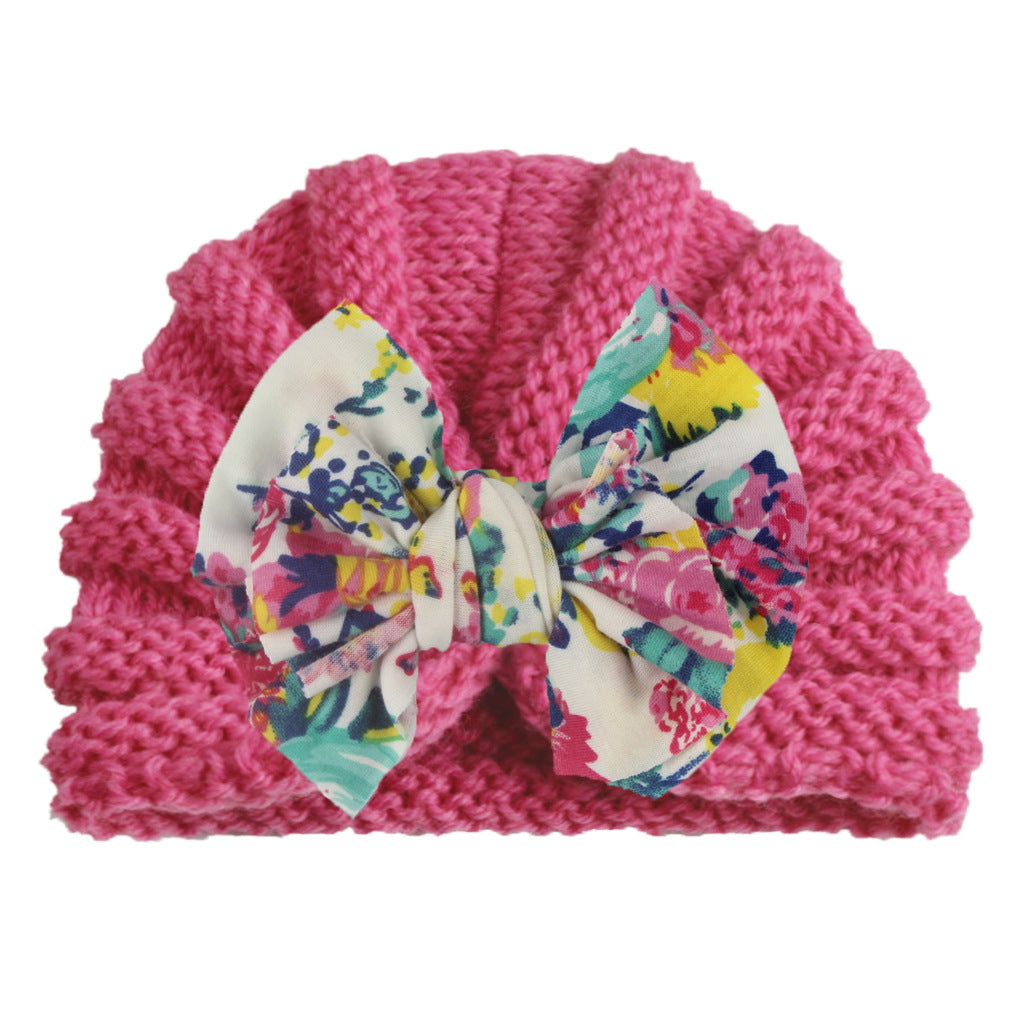 2022 European and American new baby print bow hat children autumn and winter warm knitted hat baby hat