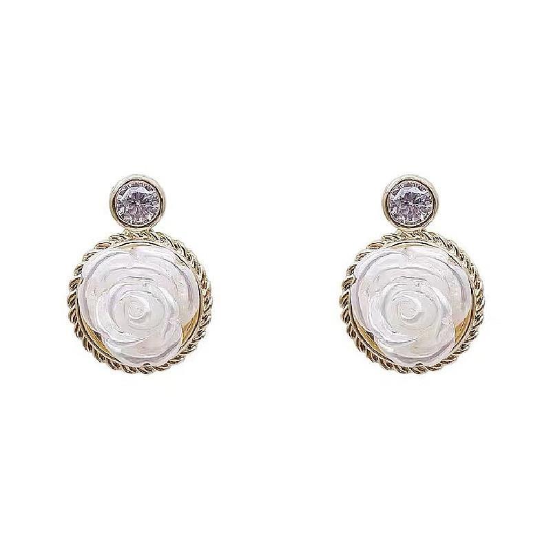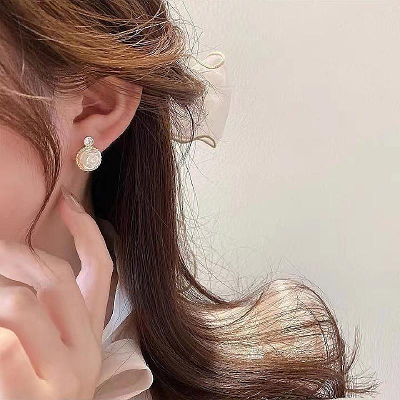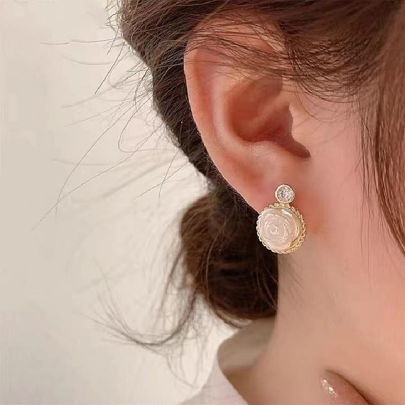 2022 Korean white camellia earrings women's summer niche design silver needle single diamond stud earrings Hepburn style earrings