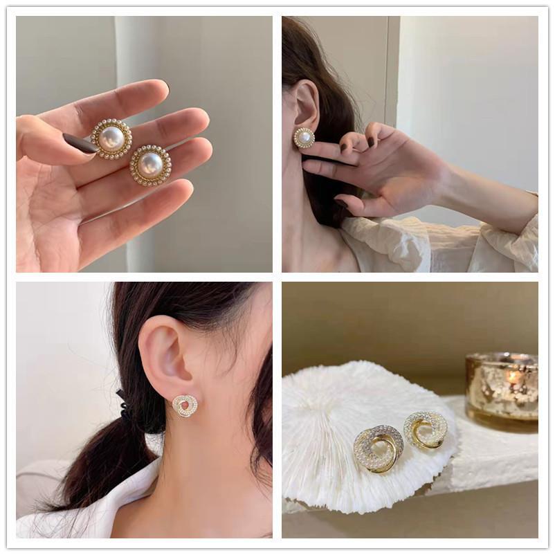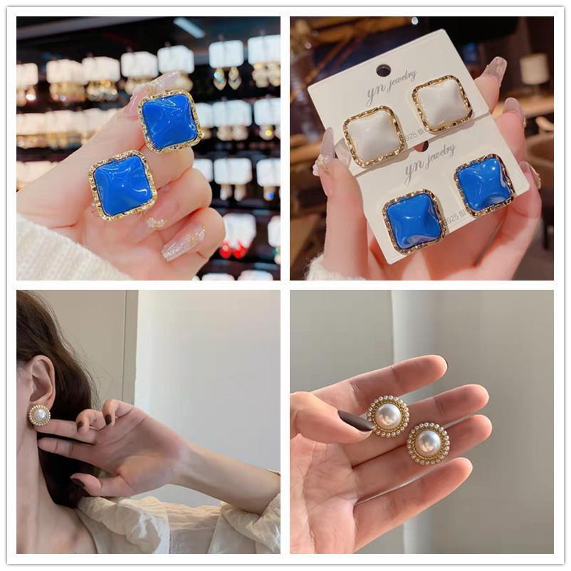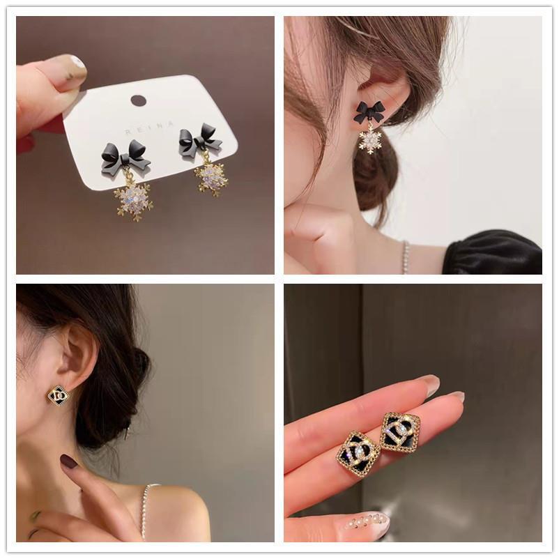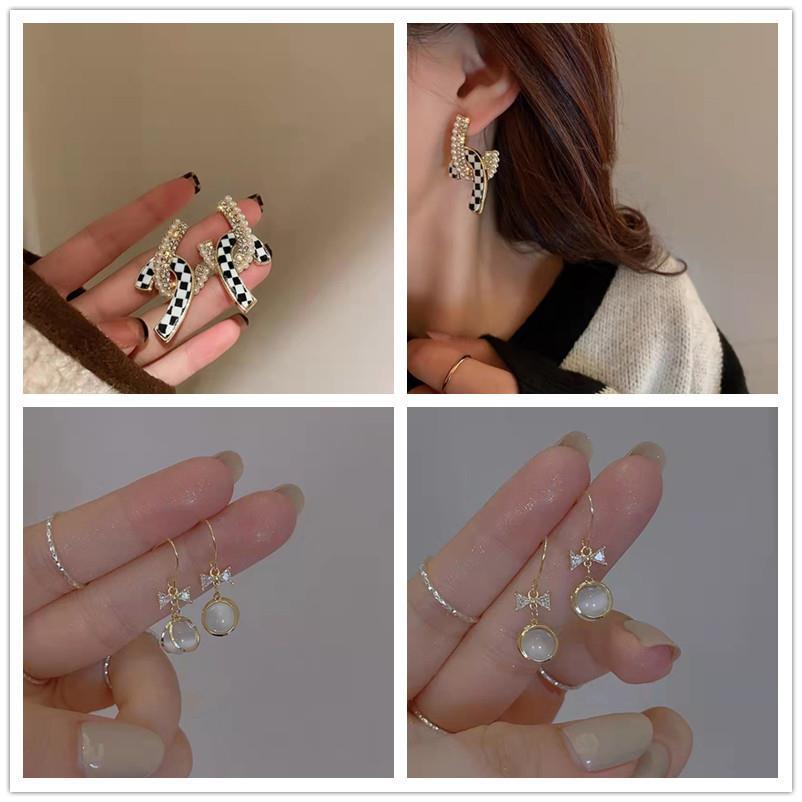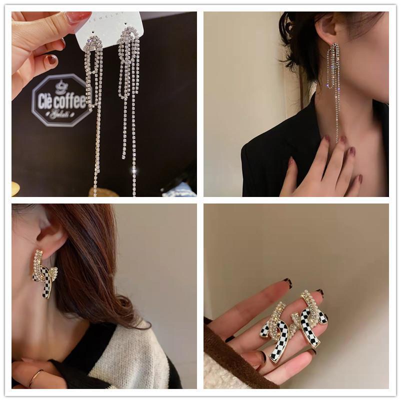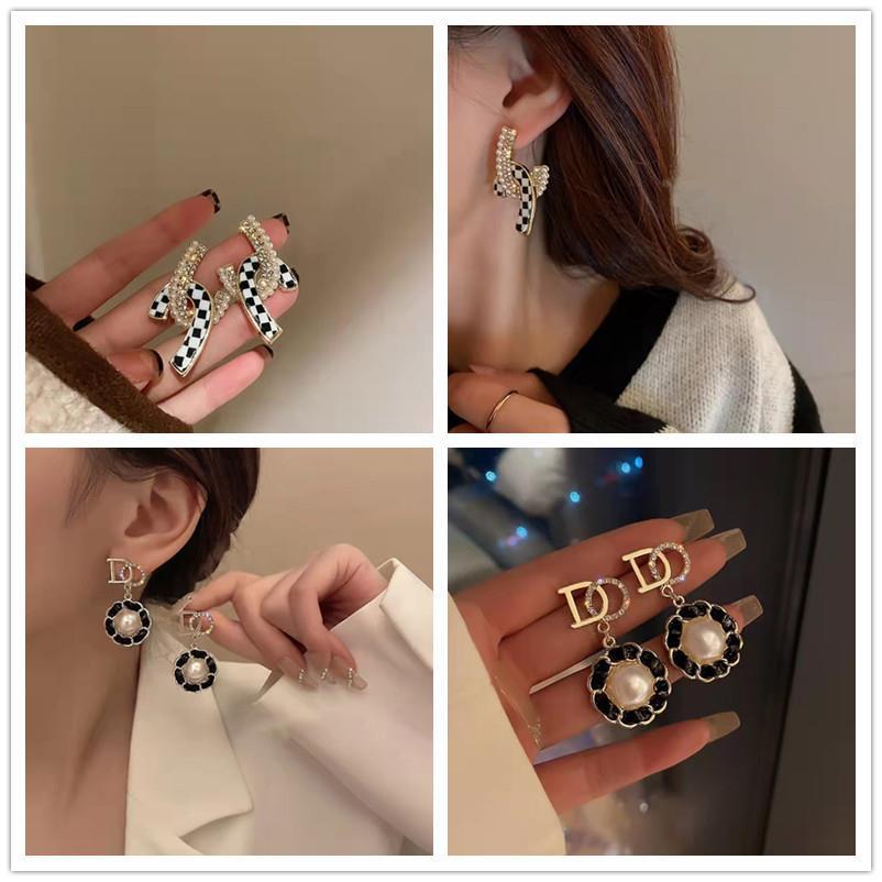 2022 new black and white square earrings Dongdaemun fashion earrings personality temperament C-shaped diamond-studded pearl earrings