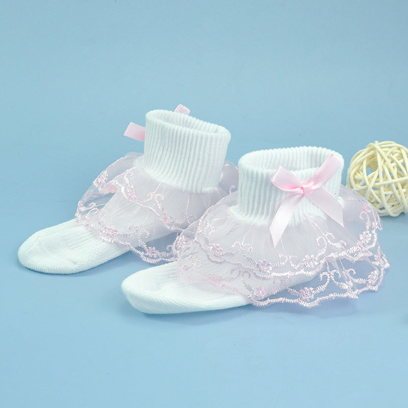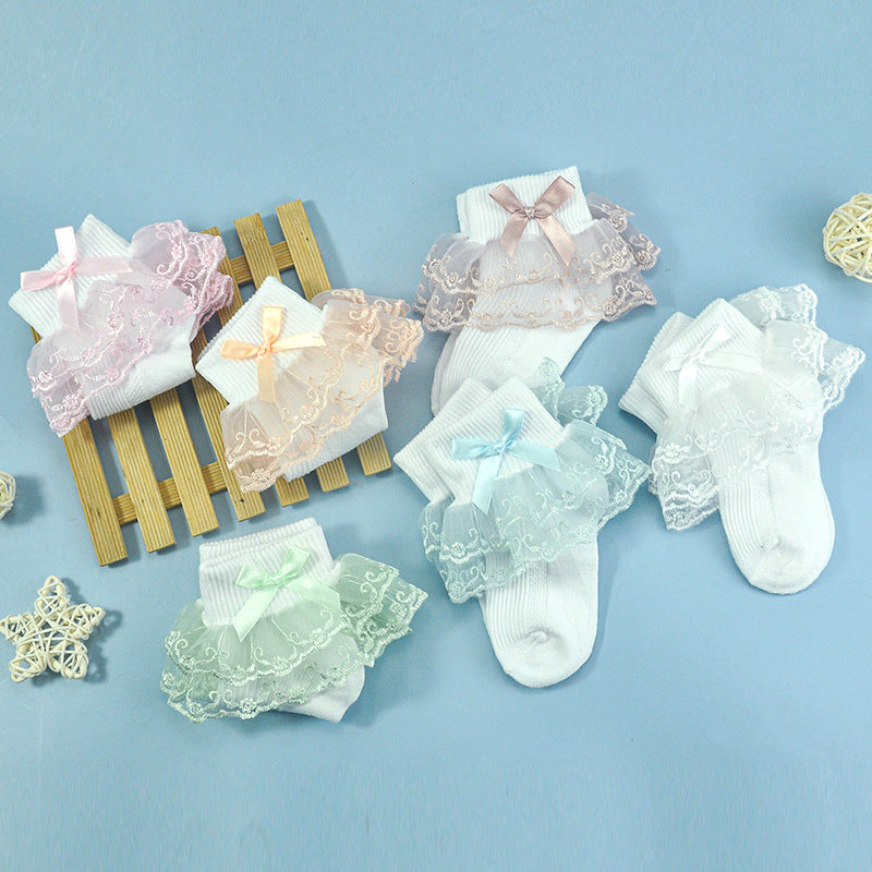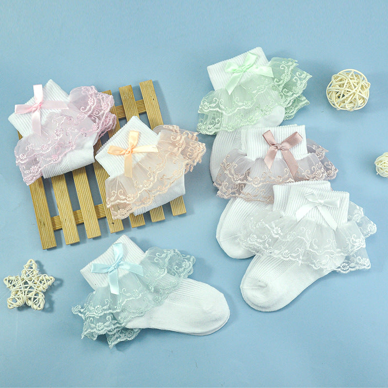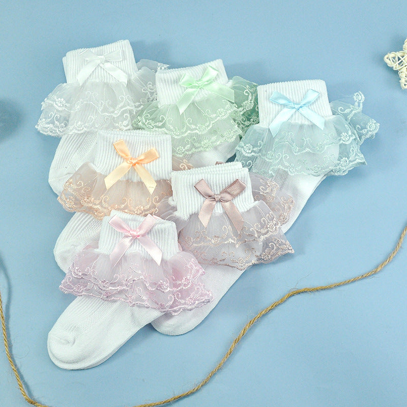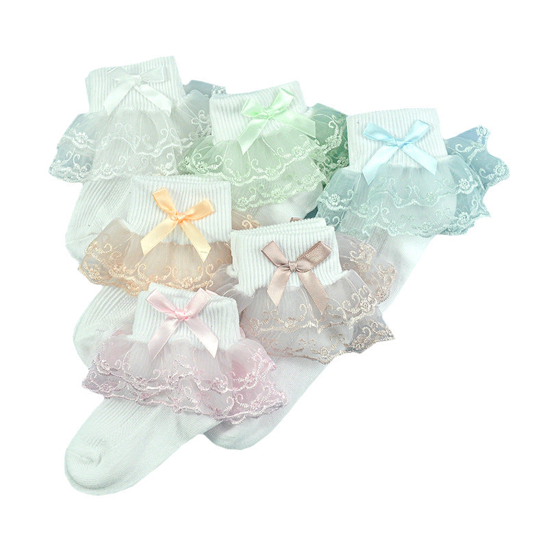 Girls socks bow decoration double layer lace socks colorful lace jacquard children socks baby dance socks