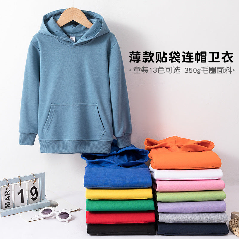 New version of spring and autumn terry baby children's clothing patch pocket hooded sweater top solid color Korean version printed class service printed logo